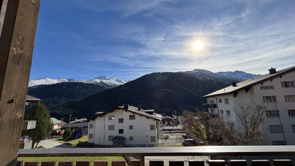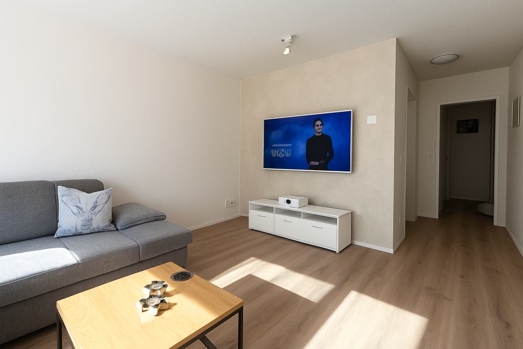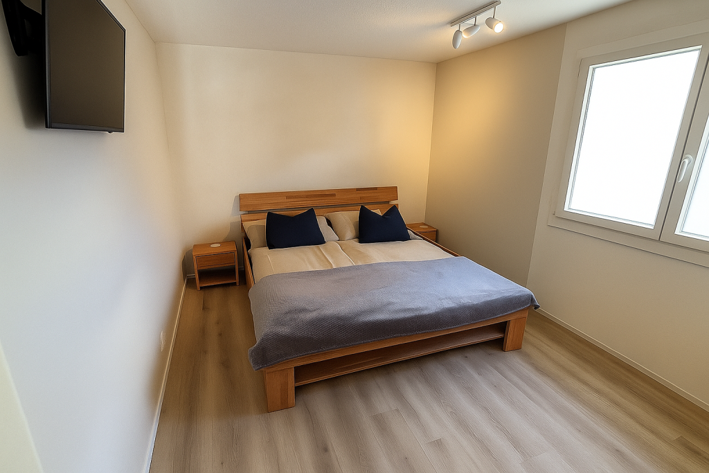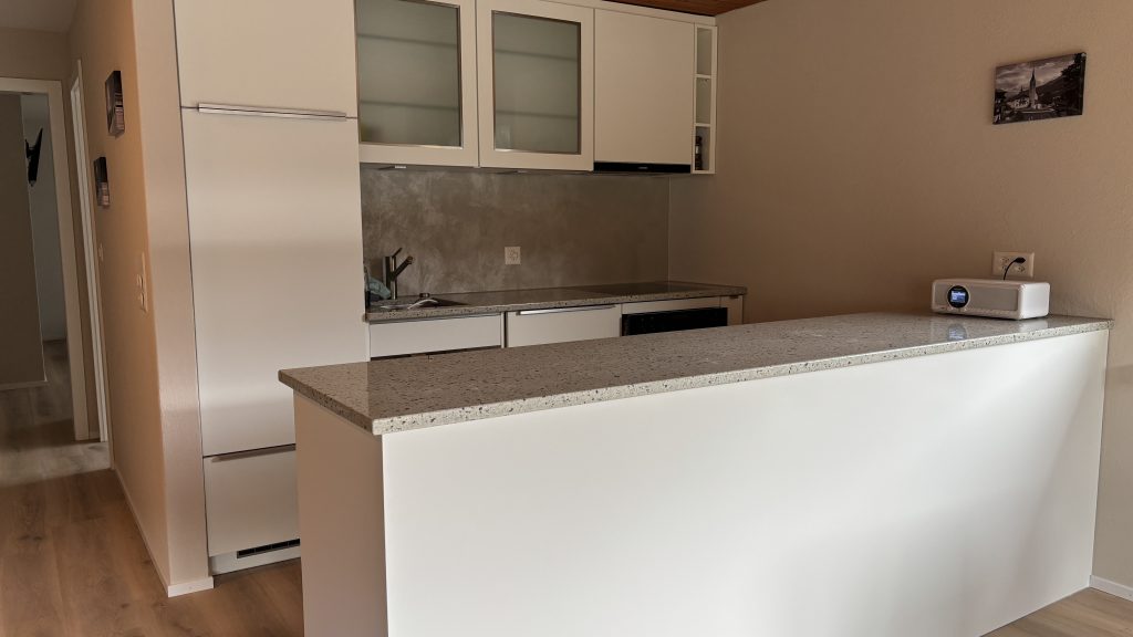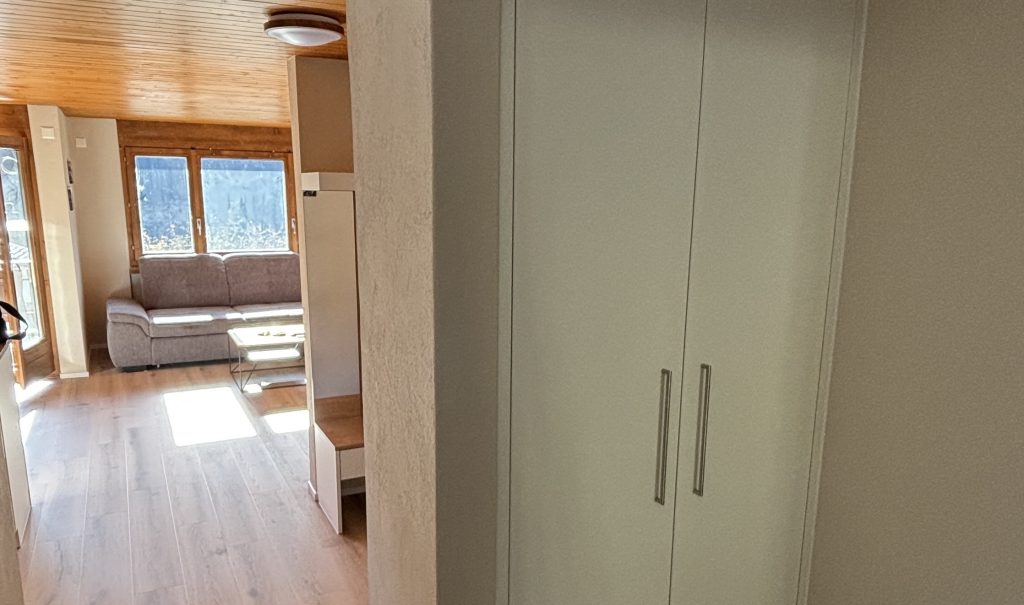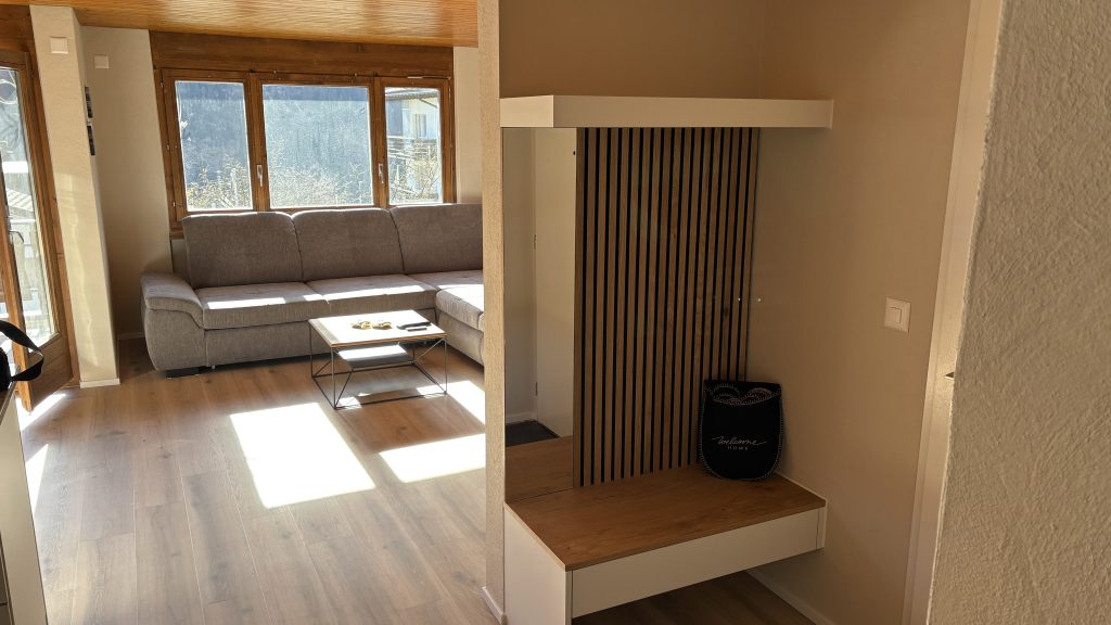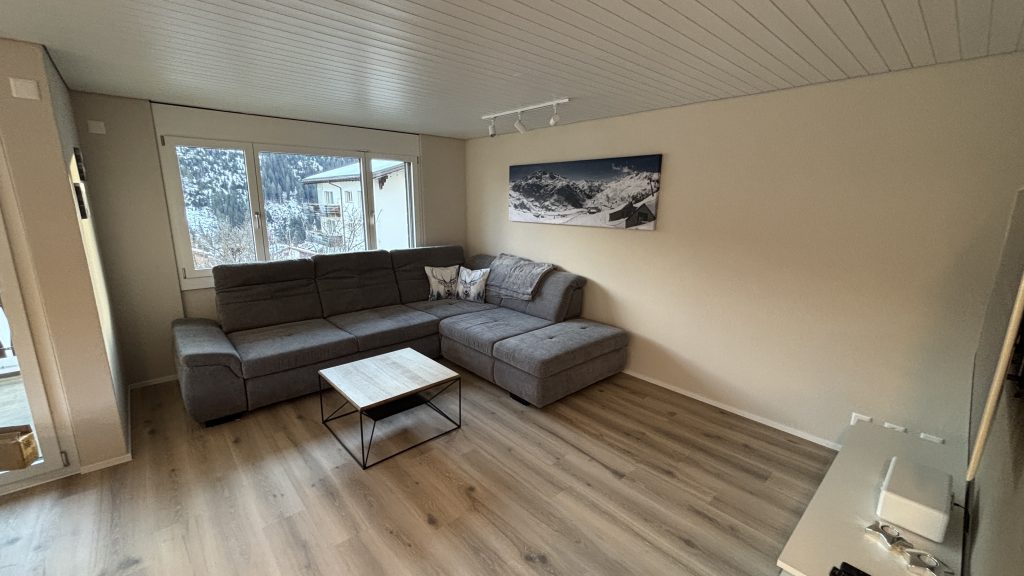 Wohn,- Esszimmer mit Schlafcoach, Esstisch, SmartTV inkl. Apple-TV Box und MusikanlageVollausgestattete Küche mit Backofen, Herd, Kühlschrank und Spülmaschine1. Schlafzimmer mit Doppelbett, Einbauschrank und SmartTV – 2. Schlafzimmer mit 2 EinzelbettenEingangsbereich mit Garderobe und EinbauschrankWC, Lavabo und DuscheSicht vom Balkon