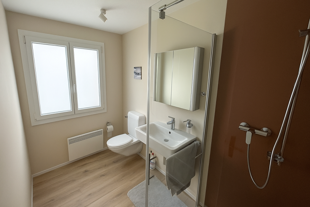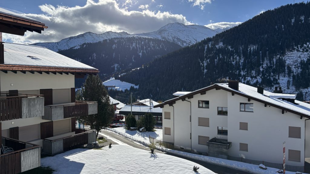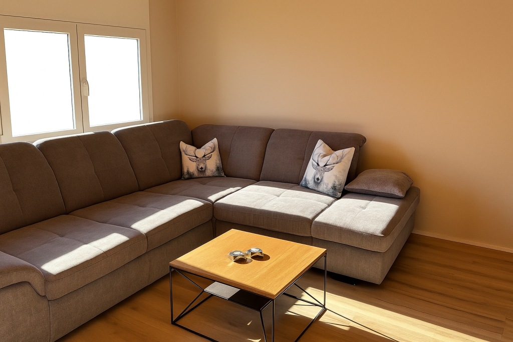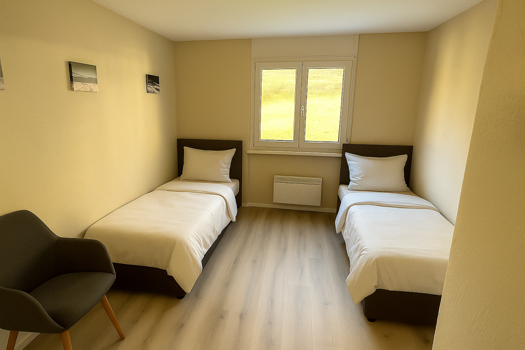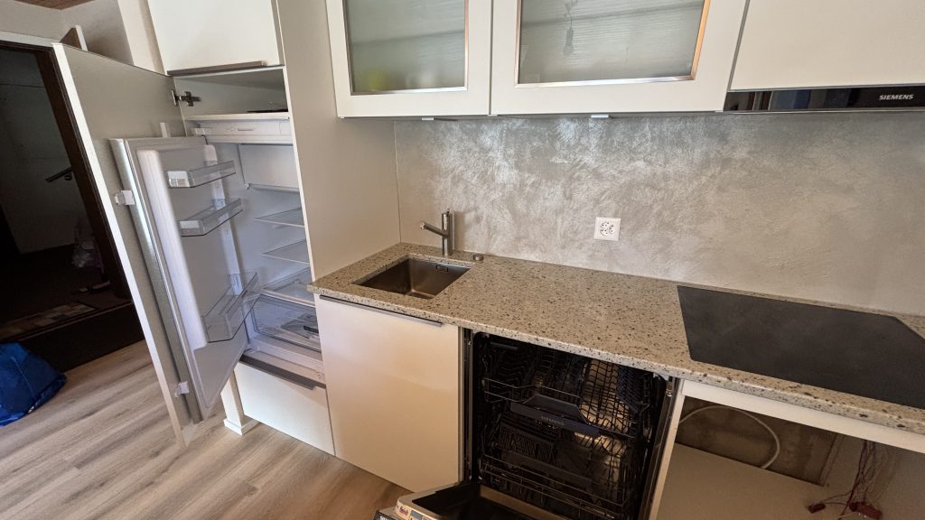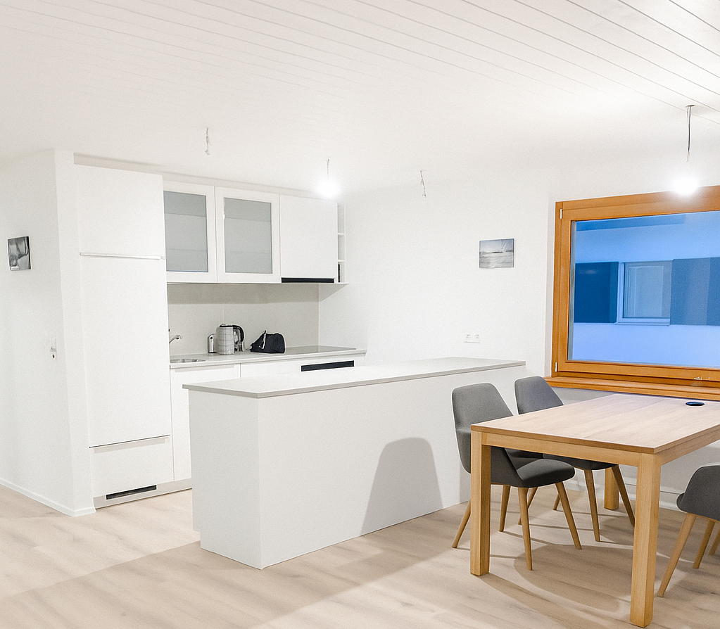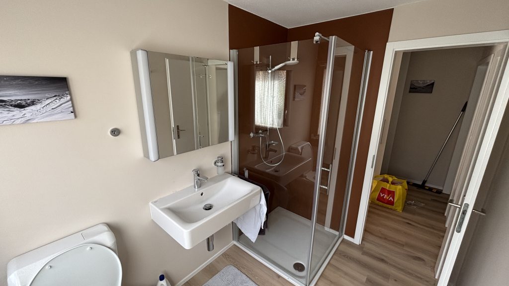 Wohn,- Esszimmer mit Schlafcoach, Esstisch, SmartTV inkl. Apple-TV Box und MusikanlageVollausgestattete Küche mit Backofen, Herd, Kühlschrank und Spülmaschine1. Schlafzimmer mit Doppelbett, Einbauschrank und SmartTV – 2. Schlafzimmer mit 2 EinzelbettenEingangsbereich mit Garderobe und EinbauschrankWC, Lavabo und DuscheSicht vom Balkon